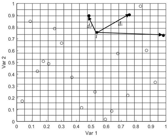 It is possible for random LHS to have as high as l!N−1 permutations, causing it to not be unique. Later, the reason becomes the researcher’s passion to solve the problem. One choice to tackle the problem is a combination with optimization technique, called optimum LHS. The quantification technique aims to optimize the Euclidean distance of each n random variable. The distance of all random variables in the design space is computed, ranking from minimum to maximum. Then, finding the maximum of the minimum distance is called Euclidean maximin distance (Mm) or L2 discrepancy. Unfortunately, this technique can increase computational load [46]. Euclidean maximum distance technique defines d = (d1, d2, …, dn(n−1)/2) in each set, where d is the Euclidean distance between n random variables as presented in Equation (3). The first ranking from minimum (min) to maximum (max) of the set is defined as d1 as shown in Equation (4). The definition of d is presented in Figure 2 and formulated as follows: