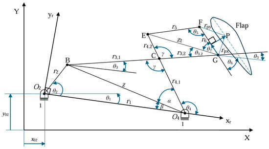 The objective function of this mechanism begins with the mathematical expression of the position and angle of the system. The six-bar mechanism model is created in the form of the Watt I model, adapted from the simple four-bar model. The second loop on top of the model is where the flap of the aircraft is installed at a target point P as shown in Figure 3. In this research, the mechanism is set to operate in the crank-rocker model to simplify the output from the optimizer, so the system should operate continuously driven by the crank. The outcome mechanism’s possibility varied in open and cross mode. To simplify the mechanism, the acceptable model in this research will be the open mode in both the first and second loops. The combination of those two loops results in one degree of freedom, meaning one input is needed to control it. The mechanism consists of six linkages and seven joints. Link 1(O2 O4) is designed to be the fixed frame and forms the first loop with the other link, like link 2 (O2B), link 3,1 (BC) and link 4,1 (O4C). The input link, which is expected to be driven by a motor or actuator, is link 2 (B) while the second loop comprises link 3,2 (CG), link 4,2 (CE), Link 5 (EF) and link 6 (FG). The study will focus on the target point (P) attached to the upper part of link 6 (FG). The kinematic diagram of the follow mechanism is shown in Figure 3. The model is written in the global axis, which has angle θ1 with the fixed frame. The motion of the target point can be obtained by the calculation of the initial variable r1, r2, r3,1, r3,2, r4,1, r4,2, r5, r6, rpx, rpy and others. The position of the point of interest is expressed as follows: