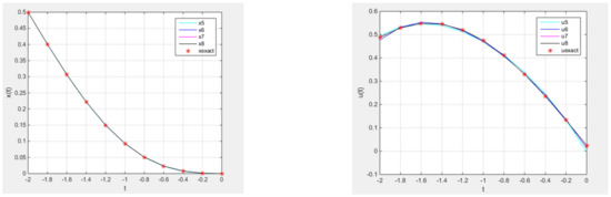 As increases, the absolute errors and decrease significantly, and the results will rapidly tend to the exact values. This table illustrates that the NSSG polynomials have a good convergence rate.