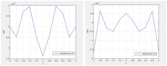 The above figures show the decreasing absolute error by the suggested algorithm based on NSSG polynomials. The optimal performance index value , which is obtained by the proposed method for , is a good approximation. The approximate state and control variables are, respectively, as below