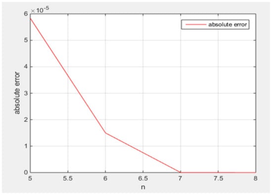 Figure 2 shows the decreasing absolute error by the NSSG polynomials with the state parameterization technique. Figure 3 is the last illustration that displays the graph of the absolute values of with different orders of the polynomials. All the tables and figures show that the suggested methodology is capable of providing numerical solutions for the controlled osculation problem with high accuracy. The solution obtained from the proposed approach is in good agreement with the existing results, thus demonstrating the reliability of the proposed schemes.