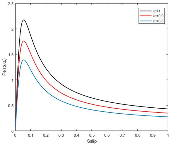 Figure 5. The relationship between voltage and active power at different slip rates.