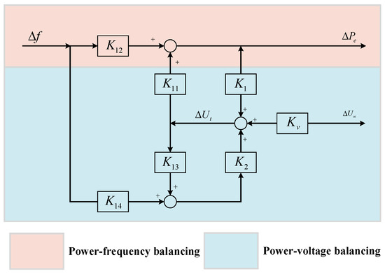 In the system frequency response model, it is essential to establish the relationship between active power and system frequency, which is also called the frequency characteristics. According to the Equations (7)–(10), the induction model can be established as shown in Figure 3.