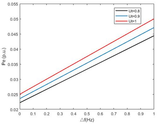 In response to system frequency disturbances, the slip rate of the induction machine undergoes instantaneous changes, leading to an immediate adjustment in active power to counteract the differential power of the system. This alteration in active power disrupts the equilibrium of the rotor motion equation of the induction machine [28]. According to the proposed model, both system frequency and node voltage are identified as key factors influencing the active power of the induction machine. The relationship between them and active power is depicted in Figure 4 and Figure 5.