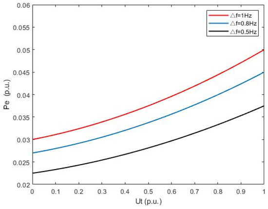 Figure 9. The relationship between voltage and active power under different frequency deviation.