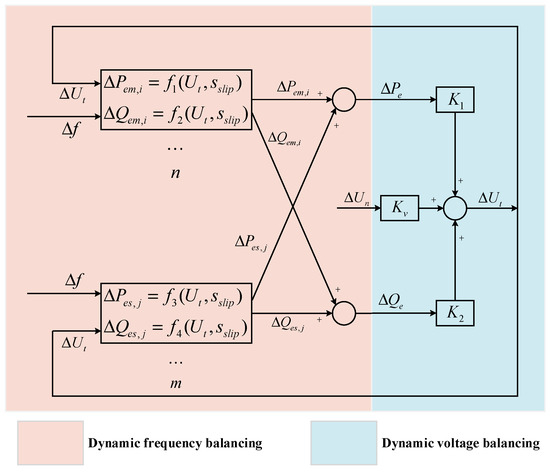 As a typical dynamic load, the dynamic characteristics of an induction machine significantly impact the stability of the power system. As depicted in Figure 3, the grid-connected induction machine exhibits dynamic voltage and frequency balance. During a disturbance in the active power, the system frequency is disrupted and undergoes changes, which further affect the slip rate of the induction machine. As in Equations (8) and (10), the variations in the slip affect both the active and mechanical powers of the induction machine. Equation (5) describes how these changes disrupt the power dynamics equilibrium of the induction machine. Equation (9) further elucidates that alterations in slip also influence reactive power variations. The fluctuations in both active and reactive powers of the induction machine subsequently impact changes in system power flow. Due to the variation in the front-end node voltage, the constant voltage of the induction machine node is no longer maintained, thereby amplifying the frequency response of the induction machine [27].
