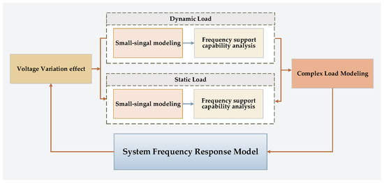The symmetry between the generation and load sides of power systems plays a crucial role in determining the balance and stability of the overall system [1]. The power load comprises both dynamic and static loads, with their frequency support capabilities playing a pivotal role in maintaining the active power symmetry of power systems [2]. Due to the increasing share of renewable energy and the widespread use of large-scale power electronic equipment, the inertia level in new power systems is on a declining trend, posing a serious threat to their safe operations [3,4,5,6,7]. In comparison with traditional power systems, there has been a gradual decrease in inertia on the generation side and an increase on the load side [8]. Further research is needed to explore the system’s frequency support capabilities within the context of decreasing inertia levels [9]. However, in comparison to traditional synchronous systems, this new system encounters two significant challenges [10,11]. Firstly, there is a pronounced fluctuation and intermittency in the output of renewable energy sources. Secondly, a significant number of wind power and photovoltaic systems, which lack rotational inertia, are replacing synchronous generators [12]. As a result, the frequency stability of the new power system is severely compromised. In comparison to the conventional power system, the frequency response capability of the load side should not be overlooked [13,14]. Therefore, it is crucial to investigate the frequency response capability and response principles of the power load to ensure the symmetry and stability of modern power systems [15,16].