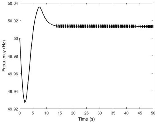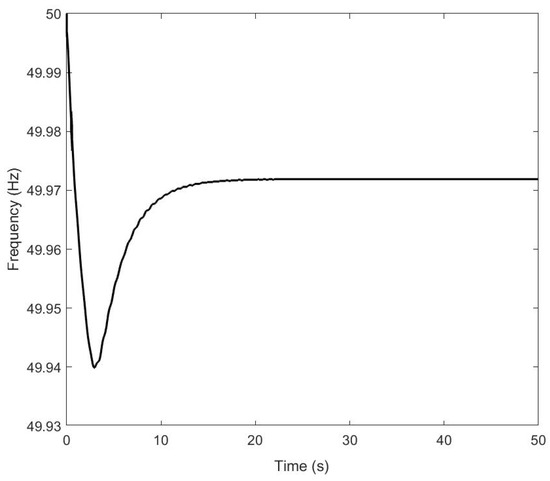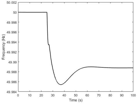 To investigate the parameter impact of the power load on the system frequency, the minimum point of the system frequency varies with the system inertia value. At time t = 0   s , a disturbance of the same Δ P d =   0.025   p . u . is applied. The final result is shown in Figure 21.