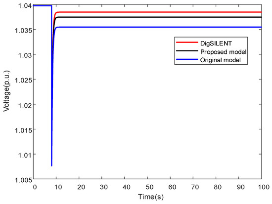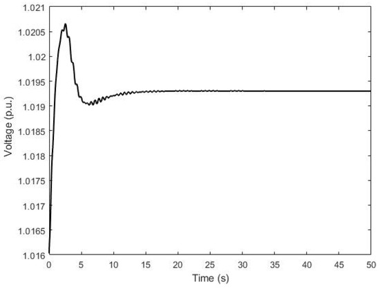 The proposed model is firstly verified using MATLAB/SIMULINK and PSASP using the power system model in Figure 1. Parameters of dynamic load and static load are shown in Table 2 and Table 3, respectively. The simulation duration is 50 s, and the system synchronous generator is equipped with primary frequency modulation equipment. The output quantity is system frequency f , node voltage U t , and dynamic load active power offset P e . In the steady-state condition, Δ f = 0 , Δ U t = 0 , and Δ P e = 0 . At t = 0 , a disturbance of Δ P d = 0.05   p . u . is applied, and the changes in system frequency, voltage, and active power of load are shown in Figure 12, Figure 13 and Figure 14. The dynamic load initial point is f = 50   Hz , U t = 1.016   p . u . , and P e s = 1.025   p . u .