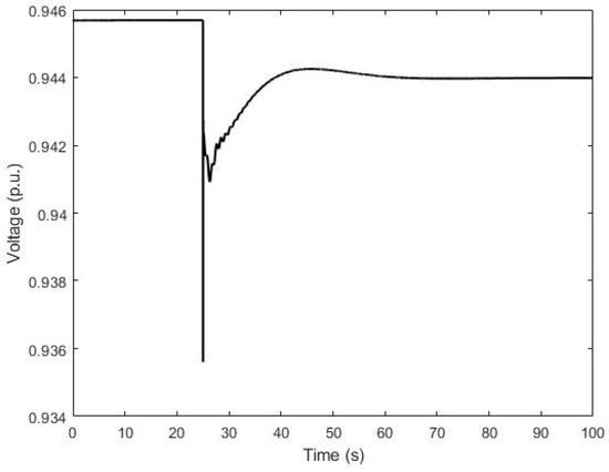 Figure 12 shows that when the system experiences a disturbance in the active power, the system frequency first drops to the nadir point and then recovers to a new steady state f n a d i r = 49.94   Hz . As illustrated in Figure 13, the node voltage of the induction machine increases immediately after the frequency changes. The reactive power of the induction machine exhibits a rapid decrease, so that the voltage lost on the line also decreases, leading to the rapid increase in node voltage. The figure illustrates that the node voltage has a small change and the overall change range is within 4.5 × 10 3   p . u .