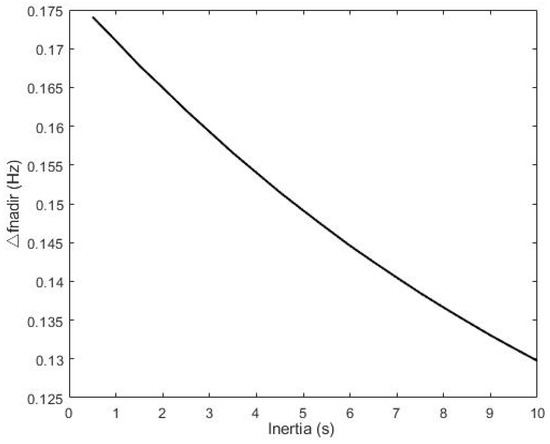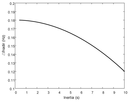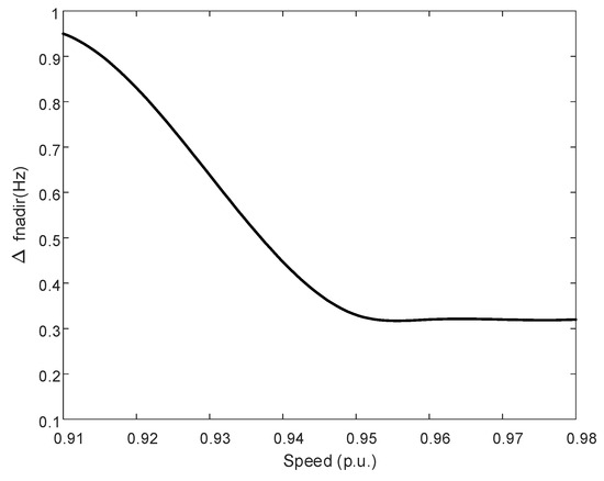 To validate the impact of induction machine speed on the system frequency response, the nadir point of system frequency was measured by applying a disturbance Δ P d = 0.05   p . u . By changing the different speeds of the induction machine, the results are shown in Figure 22.