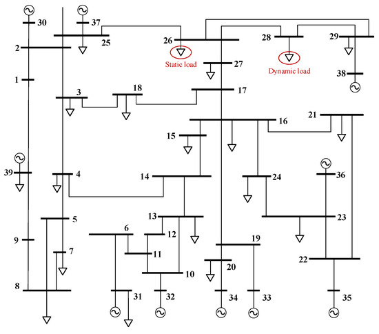 In this section, the accuracy of the proposed model method is validated using the IEEE 39-node system on the DIgSILENT PowerFactory platform. Specifically, Node 26 is designated as static load, Node 28 is designated as dynamic load, and the parameters are detailed in Table 3 and Table 2. The topology of the IEEE 39-node system is shown in Figure 24.