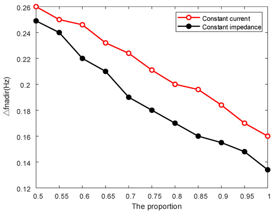 Since constant power loads have no frequency response capability, it is only necessary to adjust the proportion of constant impedance and constant current loads to analyze the frequency response capability of static loads. The initial voltages of the load node are U t = 1.072   p . u . and U t = 0.9459   p . u . A disturbance of Δ P d = 0.05   p . u . was applied to observe the nadir points of the system frequency under static loads of different proportions. The final results are shown in Figure 23.