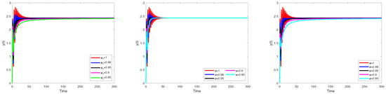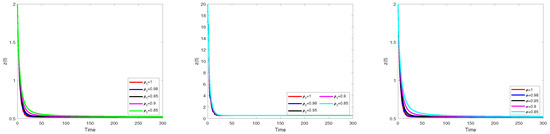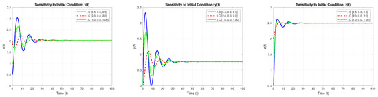 This section discusses the sensitivity of fractional glucose–insulin systems to the initial values they are given. Time plots have been taken for three sets of initial conditions: (0.5, 0, 0.5), (2, 0, 2), (1, 0, 1). Sensitivity to initial values implies that changes in the initial values cause fluctuations that are initially negligible, but quickly build up, as shown in Figure 1. The sensitivity of fractional glucose–insulin systems to initial values is a critical aspect that influences their dynamic behavior. By examining the time plots for different initial conditions, we observe that even small changes can lead to substantial differences in system trajectories. This sensitivity highlights the importance of accurate initial condition assessment and tailored interventions in managing glucose–insulin dynamics effectively.