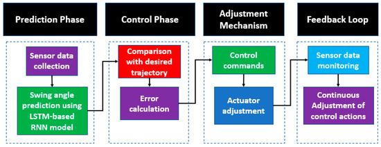 In recent years, Long Short-Term Memory (LSTM) networks [21], a specialized type of RNN, have emerged as powerful tools for modeling sequential data and capturing temporal dependencies [22]. Utilizing the memory cells and gating mechanisms in LSTM architectures allows for effective modeling of the dynamic behavior of overhead crane systems and accurate prediction of future swing angles [23]. This enables proactive control actions to be taken in real time, mitigating oscillations and optimizing crane motion for improved safety and efficiency. Figure 2 illustrates how prediction, control, adjustment mechanisms, and feedback loops interconnect to optimize the overhead crane system’s performance.