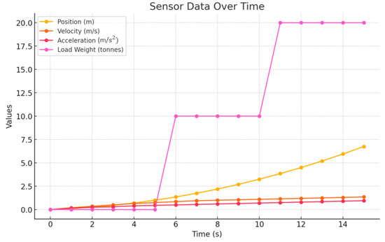 Figure 3 presents a graph generated from the raw sensor data, depicting the progression of position, velocity, and acceleration of the crane’s load as it changes over time. Initially, the load weight remains at zero, and only the position, velocity, and acceleration parameters vary. At the 6-s mark, a load weight of 10 tonnes is introduced, and subsequently, at the 11-s mark, the load weight increases to 20 tonnes. This change in load weight significantly impacts the position, velocity, and acceleration values, illustrating the dynamic nature of crane operations.