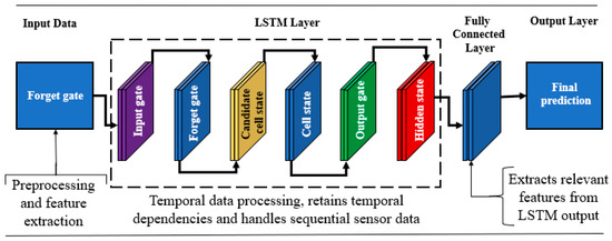 The LSTM-based RNN architecture was designed to effectively capture temporal dependencies in the sensor data and predict swing angles with high accuracy. LSTM layers were chosen for their ability to retain information over time, making them suitable for modeling sequential data such as crane sensor readings. The architecture of the LSTM-based RNN model consisted of two LSTM layers followed by fully connected layers as illustrated in Figure 4.