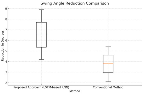 Graph illustrating the swing angle reduction comparison between the proposed LSTM-based RNN approach and the conventional method across different load conditions.