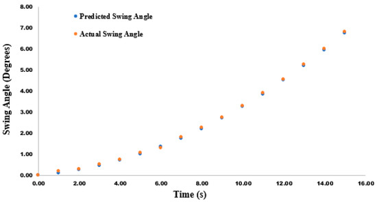 where represents the actual swing angle at time , represents the predicted swing angle at time and is the total number of observations. For the dataset used in this study, it was found to be approximately 0.046875 degrees. This result indicates that, on average, the predicted swing angles deviated from the actual values by approximately 0.046875 degrees. So, by applying Equation (14), the accuracy of the model in predicting swing angles is approximately 98.6% when compared to the mean of the actual swing angles.