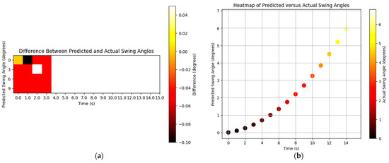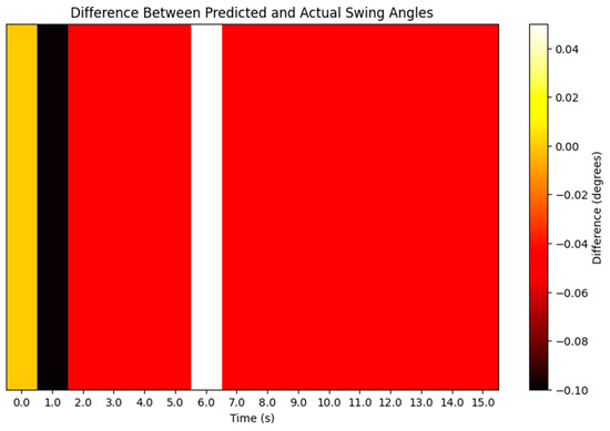 Figure 9 highlights the difference between the predicted and actual swing angles over time. Initially, the discrepancies were minimal, demonstrating the model’s strong performance at the outset. As time progressed, although the differences slightly increased, they remained within an acceptable range, confirming the model’s robustness in maintaining reliable predictions. The accurate prediction of swing angles is crucial for enhancing the safety and efficiency of crane operations. By minimizing the swing, the risk of accidents and load instability can be significantly reduced.