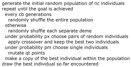Basically, these demes remain alone for most of the time by way of this particular permutation; every generations, a totally random permutation of length merges them all together, thereby allowing individuals to migrate among them. From a computational perspective, the application of crossbreeding does not involve any real overhead with respect to the rest of the methodology.