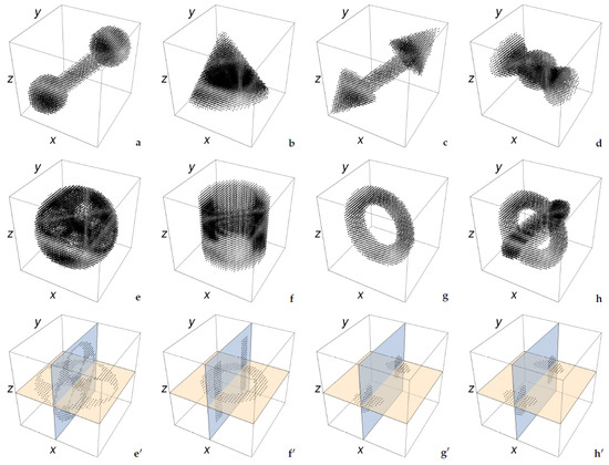 Some of the objects we considered for our experiments (a–h). For a better visualization, they are presented here by small dots. The lower objects (e–h) exhibit hollow spaces and therefore are shown also by means of a couple of their sections (e’–h’). For example, the sphere (e) contains six smaller empty spheres (e’).