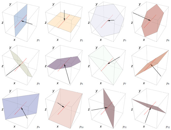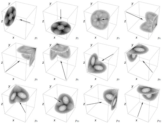 Besides the natural direct access through coordinates to each point in the individual, we created a structure (essentially a lookup table of memory locations of about MiB with , respectively) that provides quick access to a whole projection plane by grouping all points that belong to it, arranged so as to reduce memory faults. We chose twelve particular projections (Figure 4) because points along the same direction vector are adjacent to each other and because they make it easy to create the lookup data structure. An animation that we include in the supplementary material shows that the projection planes vary in shape and size inside the cube, depending on both the angle and depth of the considered projection. As a complete example, Figure 5 shows the projections of the object in Figure 2e.