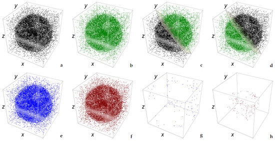 Given two parents (a,b), the offspring (c,d) are obtained by a random cut along one of the twelve directions, which is also randomly selected ( in this example). It is usually needed to add or remove some points from the offspring (e,f) to keep their number. These points are highlighted in (g) (which shows the difference between (c,e) and (h) (which shows the difference between (d) and (h)). For interpretation of the colors, the reader is referred to the electronic version of this article.