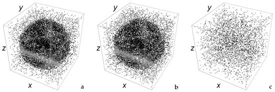 The proposed methodology allows us to directly reconstruct cubes with binary values; for practical purposes, we will consider points with and 128. It must be noted that these sizes correspond to binary images with about , and pixels, respectively, in the case of the standard two-dimensional discrete tomography; this provides a rough sense to compare our methodology against those already known in the literature in terms of data complexity.