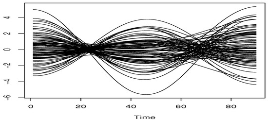 where and are two real random variables. In order to cover more general cases, we consider two examples of . In the first example, we assume that and . While, in the second example, we generate from and from . In both cases, the obtained functional variables are relatively smooth, allowing one to choose the spline -metric (see [31]). A sample of the first co-variate curves is plotted in Figure 1.