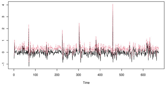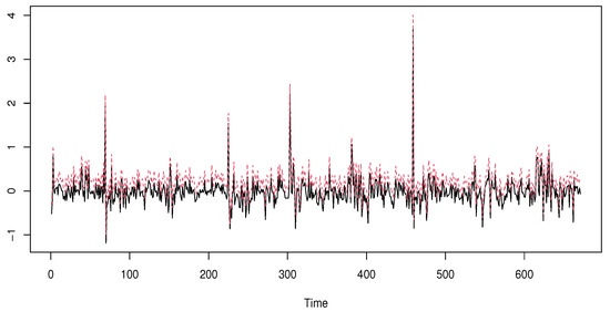 Once again, the comparison confirms the superiority of the kNN ES-expectile regression over the standard ES-expectile and the kNN ES-quantile model. This superiority is confirmed by computing the Mse error (9) of the three models. We obtain, respectively, 0.0274 for the kNN ES-expectile, 0.108 for the standard ES-expectile 0.201, and for the kNN ES-quantile. For a deep examination of the behavior of the three estimators as financial risk models, we use the backtesting measure based on the cover test developed Bayer and Dimitriadis [32]. Specifically, we apply the version so-called one-side intercept expected shortfall regression backtest. This last is obtained using the routine code esr-backtest from the R-package esrback with . We compute the p-values of the 70 observations, randomly chosen, from the above 670 testing observations. The average of the obtained values confirms the first statement that is the kNN ES-expectile regression, which is more adequate than the standard ES-expectile and the kNN ES-quantile model. Specifically, the average of the p-values of the kNN ES-expectile is 0.035 against 0.067 for the standard ES-expectile, and for the 0.058 kNN ES- quantile.