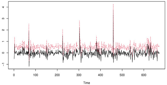 We explore the functional path of the considered data by cutting the process with pieces of 30 points. These pieces represent the functional regressors . Furthermore, we use the same strategy as in the simulated data. Indeed, we choose as the curve of and . Now, to insure the independence structure of our work, we select distanced observations. Specifically, from 2790 observations, we choose 90 equidistant independent values from which we construct our learning sample . Thus, we compare the three estimators , , and using a real datum, . Such estimators are computed using the same algorithm of the simulated data. We use the same kernel and select the smoothing parameters k and h by the rule (6). We use the metric obtained by the PCA-metric. We refer to Ferraty and Vieu [31] for more details on the mathematical formulation of this metric. The comparison results are given in Figure 4, Figure 5 and Figure 6, where we plot the true values of 670 testing observations (black line) versus the estimator and (red line) for values of .
