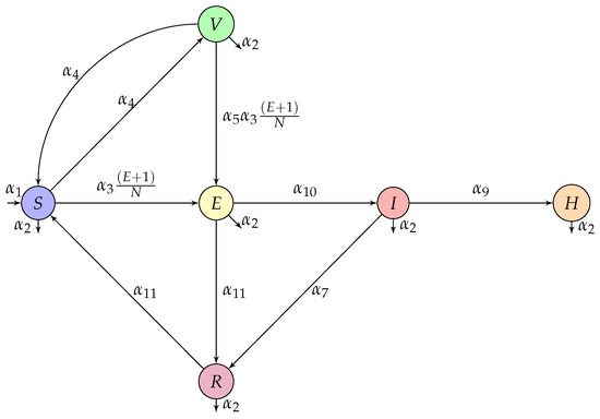 Individuals in class E are recruited by the forces of the infection and , move to class I at rate (after the incubation period) and to class R at rate . Infected individuals are recruited with rate from class E, recover at rate , and an fraction of them become hospitalized. The recovered population is increased from classes , and H at rates and , respectively, and become susceptible again at rate .