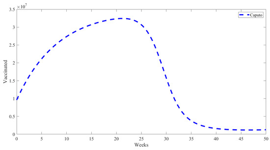 The dynamics of the vaccinated population over time are depicted in Figure 4 using the fractional Caputo derivative model. The figure illustrates a rapid initial increase in the population that has received vaccinations, followed by a consistent growth phase until the apex occurs around week 20. The vaccinated population experiences a substantial and swift decline following its apex. The vaccinated population is expected to stabilise towards the conclusion of the observation period, with the number of vaccinated individuals approaching zero, according to the fractional Caputo derivative model. This dynamic implies that the model takes into account factors such as the vaccination administration rate, the efficacy of the vaccination campaign, potential waning immunity, or other factors that may result in a decrease in the vaccinated population over time.