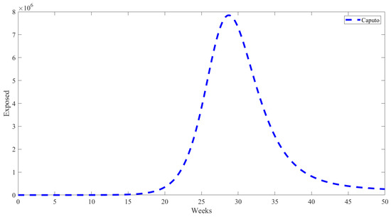 The Figure 5 shows how the number of people exposed to infection changes over several weeks using the fractional Caputo derivative model. In the beginning, only a few people are exposed, but around week 20, there is a significant increase. The highest number of people at risk of exposure is around weeks 27–28, usually during the winter. After that, the number of exposed people drops quickly and then levels off towards the end of the period. This pattern indicates a quick shift from a low-exposure period to a high one and then back to a low one, reflecting a short but intense period of exposure in the population.