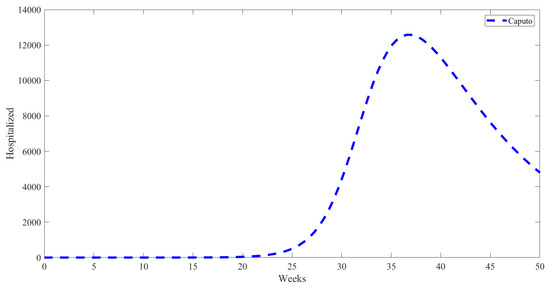 Figure 6 illustrates the temporal evolution of the hospitalised individuals over time using the fractional Caputo derivative. It is clear from the graph that there are small numbers among the hospitalised population, and then the numbers begin to increase significantly starting from week 20. The number of patients requiring hospitalisation constantly increases, reaching its peak around week 35. After reaching its peak, there is a sharp decrease in the number of people admitted to hospitals, indicating a decrease in severe cases needing hospitalization. This phenomenon suggests that the model effectively represents the increase and decrease in hospitalisations, with a prominent phase of high numbers followed by a rapid decrease, mirroring the progression of an epidemic wave.