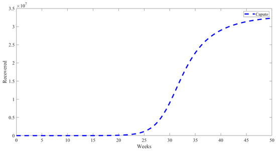 Figure 7 illustrates the temporal evolution of persons who recover over time using the fractional Caputo derivative model. The graph illustrates an insufficient number of individuals recover initially, followed by a substantial rise beginning at around week 20. There is a significant and rapid increase in the number of individuals who recover, beginning in week 25 and persisting until around week 35. Following the 40th week, the number of recovered persons remain constant, reaching a plateau after the observation period. This phenomenon indicates that the model accurately represents the recovery process, with an initial phase of quick improvement followed by stability as the epidemic wave diminishes and the number of infected people decreases.