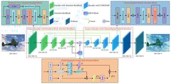 This structure was still designed with an efficient and symmetric encoder–decoder architecture. For the encoding stage, we propose a novel residual structure based on a parameter-free attention mechanism to enhance the fine-grained image feature extraction. The input image is successively convolved and downsampled by a new parameter-free attention residual block to obtain rich feature map information. While shallow feature maps often contain abundant pixel-level spatial information, deeper low-resolution feature maps usually contain high-dimensional semantic information. The deepest feature map is downsampled 16 times compared with the original input image. For such complex abstract semantic information, a global information fusion attention mechanism was used to reconstruct the feature map. This mechanism operates effectively and focuses on each feature point. The decoder is capable of recovering more valid information due to the enhancement of features under large receptive fields (RFs). During the decoding stage, we employed the channel attention mechanism to integrate features while upsampling the reconstructed deep semantic information. For the shallow features obtained from the upsampling, we recovered more detailed spatial location information by using the spatial attention mechanism. Additionally, we utilized skip connections to merge image features at the same resolution in the encoding and decoding stages.