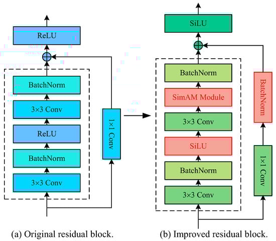 The residual structure [27] has been widely used in various deep learning tasks to address gradient vanishing and explosion issues. Therefore, in this study, we considered replacing the ordinary convolution of the encoder part with the residual structure to improve the model performance while maintaining better robustness. However, the residual structure has a limited impact on enhancing the feature extraction capability of the encoder. To address this issue, we propose two main improvements. First, we incorporated a parameter-free attention module called SimAM [28] into the residual structure to measure the importance of each feature point, enabling the extraction of fine-grained features without introducing additional parameters. Additionally, to further enhance the nonlinearity of the model, we replaced all ReLU functions in the original residual structure with SiLU, thus constructing the parameter-free attention residual (PAR) block. In contrast to the original residual structure, the proposed PAR module does not introduce additional learnable parameters, yet it effectively enhances the overall model performance. Furthermore, we conducted quantitative ablation experiments to analyze the original residual structure and the PAR module, thereby exploring its effectiveness. Figure 3 shows a comparison between the original residual structure and the improved structure.