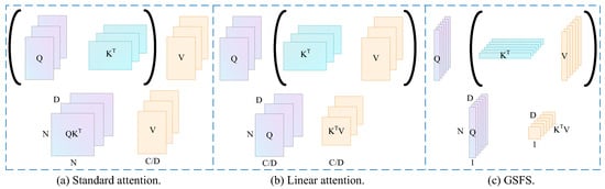In contrast, linear attention [30] modifies the computation order by prioritizing the dot product of and V and replacing the softmax with a kernel function . By altering the order of matrix multiplication, the computational complexity of linear attention is reduced to , which can be calculated as follows: