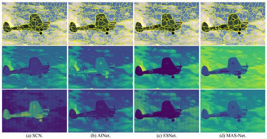 Finally, Figure 5 presents the visualizations of key feature maps in each encoder–decoder model. From top to bottom, the visualizations show the superpixel segmentation results, the first downsampling results of the encoder, and the final upsampling results of the decoder. Through the visualizations, it is evident that the framework proposed in this paper exhibited less loss of color and texture information compared with other encoder–decoder-based network models. For instance, details such as the characters, logos, and landing gears painted on the aircraft fuselage were preserved, which was crucial for enhancing the accuracy of superpixel segmentation and category perception capability. The other network models focused more on the contour information of the image, which led to their inability to generate superpixels that contained logo information, such as the segmentation results of the SCN on the tail logo in the first column and ESNet on the fuselage logo in the third column.