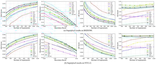 For a fair comparison, all the metric evaluations were conducted using the standards and code provided by [36]. Similar to other methods, this study primarily evaluated superpixels using five metrics: achievable segmentation accuracy (ASA), boundary recall (BR), boundary precision (BP), under-segmentation error (UE), and compactness (CO). ASA measures the ability to accurately identify objects in the image, BR and BP assess the boundary adherence of superpixels to the ground truth, UE measures the percentage of the superpixels leaked across the ground truth boundaries, and CO is used to evaluate the compactness of superpixels. Among them, higher scores of the ASA, BR, BP, and CO metrics and lower scores of the UE metric represent better superpixel segmentation results. UE is strongly correlated to ASA but not directly equivalent to 1-ASA.