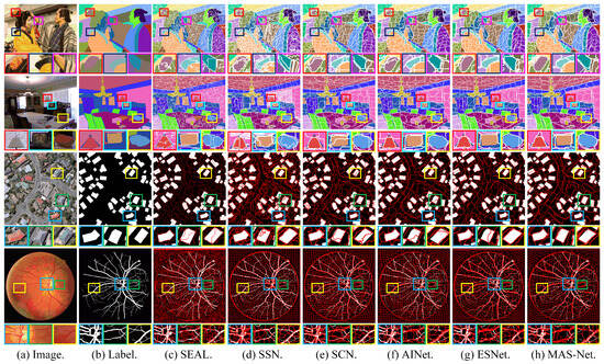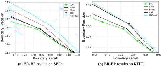To further validate the practical improvement of the model in terms of the boundary adherence in superpixel segmentation, we conducted tests on the SBD and KITTI dataset. As shown in Figure 8, AINet, ESNet, and CDS exhibited improvements in boundary segmentation accuracy and boundary recall compared with SCN. However, the proposed MAS-Net framework demonstrated a significant advantage in boundary adherence. The reason was that while AINet and ESNet improved some of the model recognition capability based on SCN by the AI module or PSG module, these two methods only optimize a single stage and have limitations in fully utilizing feature extraction and deep semantic information. In addition, the performance of CDS varied greatly when facing different datasets, with a poor boundary adhesion performance for the SBD with more categories. Meanwhile, for the KITTI dataset with fewer categories and the same category containing a large number of pixels with similar statistical attributes, ESNet, CDS, and MAS-Net achieved similar performances. This indicates that MAS-Net had a stronger generalization ability and boundary adhesion compared with the existing models. MAS-Net achieved excellent semantic feature extraction, reconstruction, and enhancement through the integration of multiple attention mechanisms throughout the entire process. This enabled the segmented superpixels to effectively perceive category information from the ground truth and adhered to their boundaries.