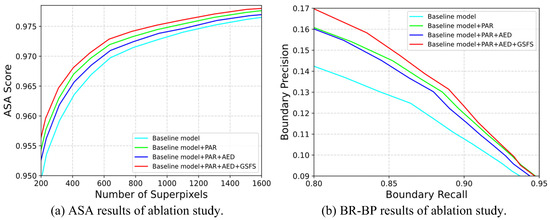 As discussed in this section, an ablation experiment was designed to validate the effectiveness of each module in the model in improving superpixel segmentation performance. The baseline model consisted of an encoder–decoder structure without attention mechanisms for comparison purposes. Various modules were added to this baseline model for evaluation, and the results are shown in Figure 9.