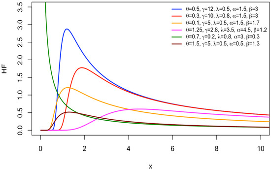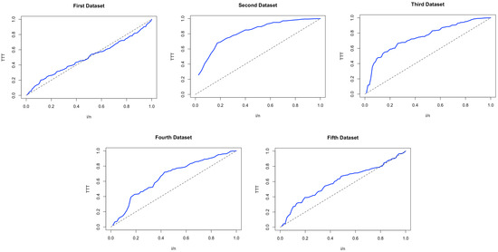Figure 3 displays the TTT plots for the fifth dataset. It can be seen that the first dataset represents a bathtub hazard rate, and the second, third, fourth, and fifth datasets represent increasing hazard rate functions. The adequacy of the five datasets for the NEGIGW is determined by comparing its fit to the following distributions with their CDFs defined as