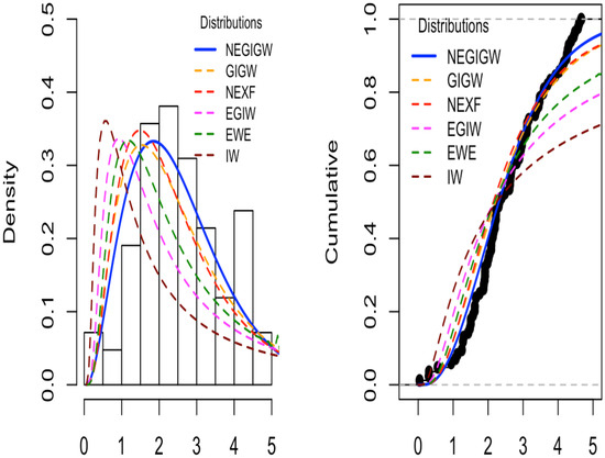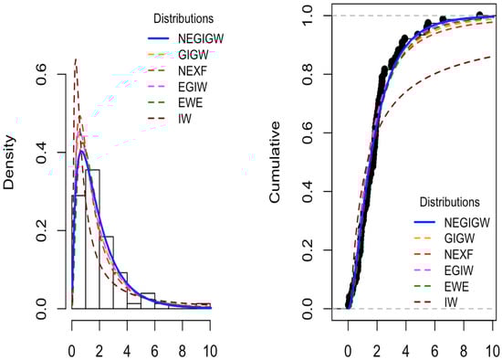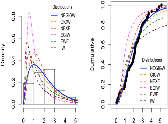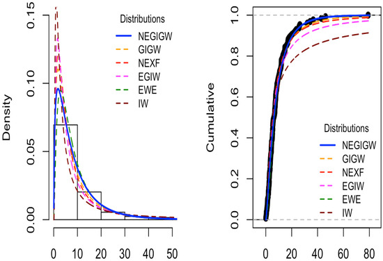 Figure 8 display the density and CDF for the NEGIGW and the competitive distributions. The histogram represents the empirical density for the data and the dot black line represents the empirical CDF for the data. The Figures demonstrate that NEGIGW best matches the actual distribution of the examined datasets. Consequently, when compared to competing distributions, the NEGIGW is the most appropriate model for the analyzed data.