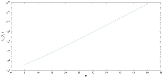 As we can observe in Table 1 and Table 2, the lower the eigenvalue or singular value is, the greater the corresponding relative error is for the usual Matlab methods eig and svd. Taking this into account, the generalized nonsymmetric matrices of order , with parameters given by (16) for , are considered. By Proposition 1, the matrices are nonsingular and TP, can be obtained to HRA and, with this bidiagonal decomposition, the four algebra problems can also be solved to HRA by using TNTool (see [24]). The condition numbers of these matrices can be seen in Figure 1. As we can observe the generalized matrices of higher degree are ill-conditioned.