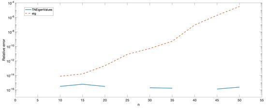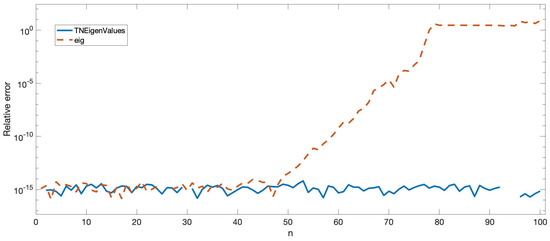 As in the previous examples, the eigenvalues of A were calculated with Mathematica using 200-digit precision, and with Matlab both using TNEigenvalues and using the usual method eig. Then, the relative errors were computed for both approximations obtained with Matlab considering the eigenvalues provided by Mathematica to be exact. Figure 4 shows these relative errors.