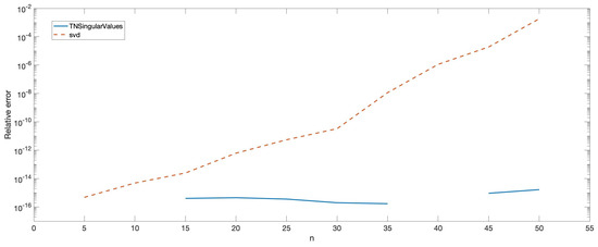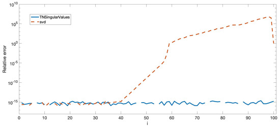 The analogous process was carried out for the singular values of A using TNSingularValues and svd in Matlab. In Figure 5, the relative errors for the singular values are shown.