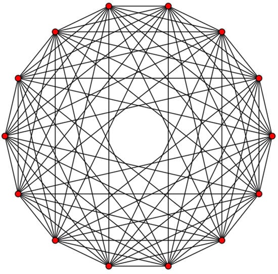 A dual representation of the 7D-hypercube in which 14 hexeracts of the 7D-hypercube are the vertices and edges representing their neighborhood connectivity. The vertices of the graph can also represent the fourteen protons of the nonrigid water heptamer, (H2O)7 in its fully nonrigid limit. (Reproduced from Ref. []).